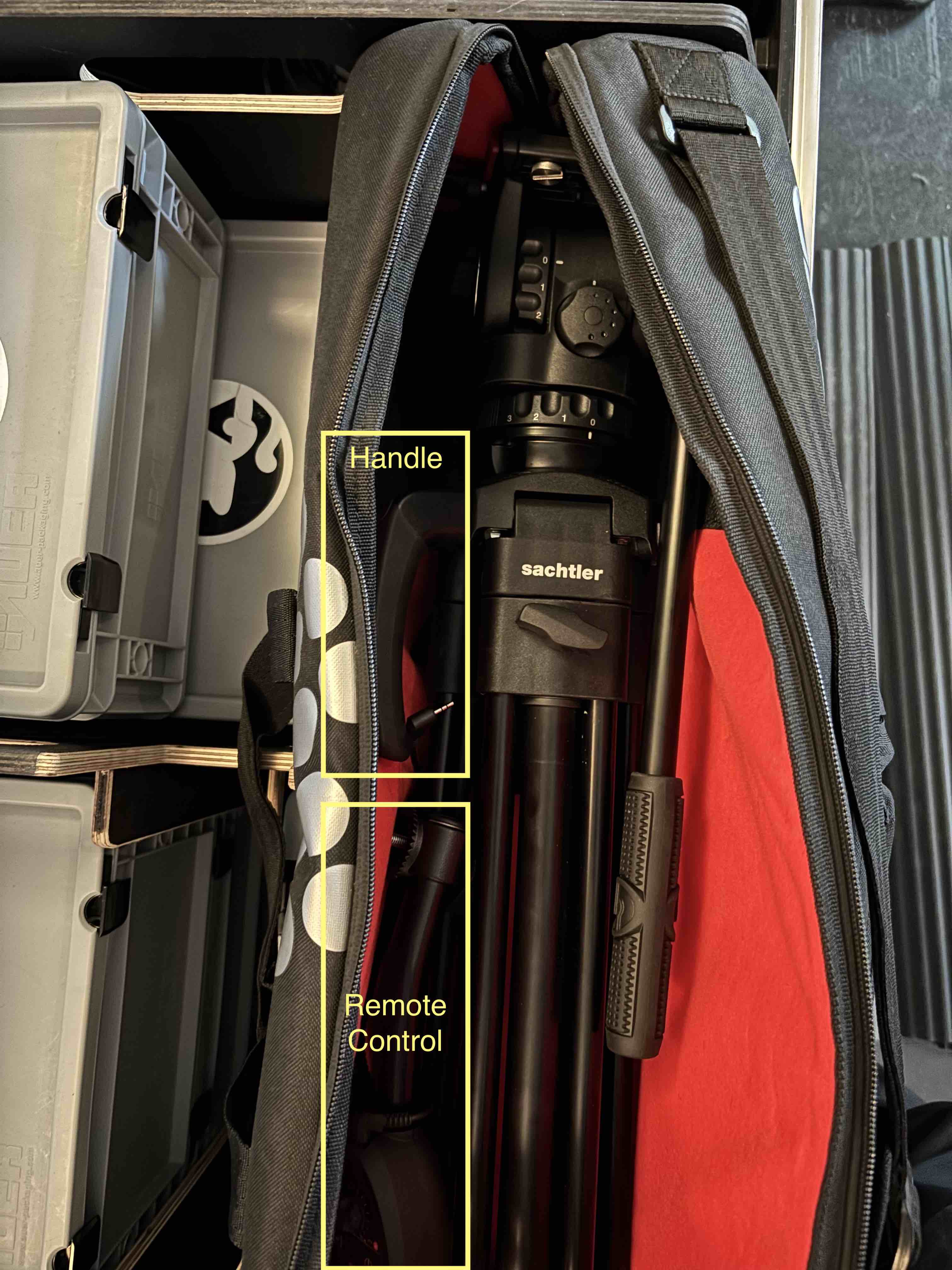 Please also take care of the remote control and place it on top and away from the front edge of the case so that it can’t be jammed when closing the lid. There should be enough space between the legs of the tripod.